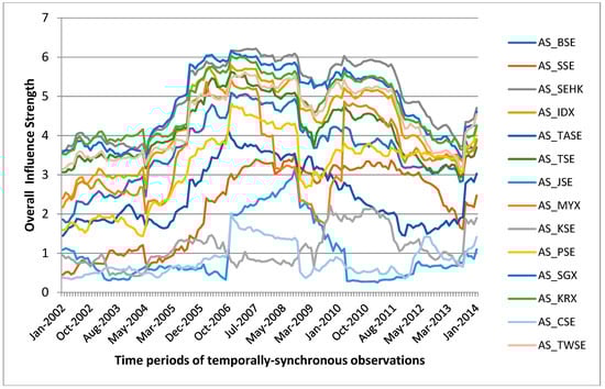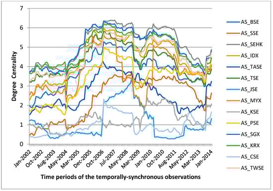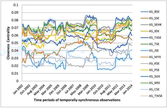 Next, we elaborate upon the findings obtained from the analysis of each of the network centrality measures. The first centrality measure considered in this study is degree centrality. This centrality measure indicates the number of links a given market index possesses. The market indices possessing higher values on this measure will have a quick transmission of information directed to the networked system. The market indices possessing a high degree centrality are more likely to possess higher levels of linkages to other market indices; hence, they would be less dependent on other market indices for the information flow. These centrally-located market indices, since they possess a greater number of linkages, would have more opportunities to exchange information targeted at them and would, therefore, be a more central character in the information flow system. In Table 2, we can notice that Hong Kong (AS_SEHK) and Singapore (AS_SGX) have the highest average degree centrality for all 151 observations. This is followed by the market index of South Korea. In the temporally-varying plot of degree centrality (Figure 3), we can notice that during January 2002–May 2004, the Korean stock market index (AS_KRX) has the highest degree centrality. From May 2004 to October 2006, the market indices of Singapore (AS_SGX) and Hong Kong (AS_SEHK) are competing for the highest values of degree centrality. After that period; the Hong Kong market index (AS_SEHK) has the highest level of degree centrality throughout the remaining time frames.