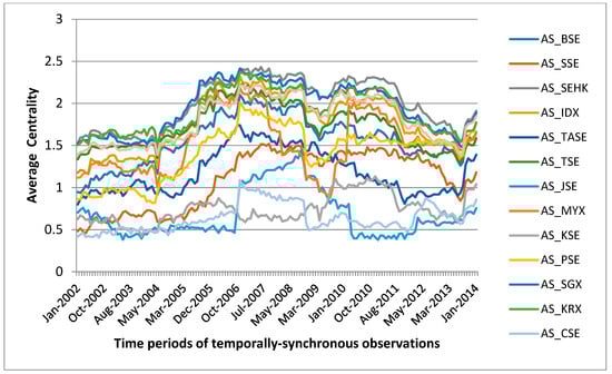 The temporally-varying plot (Figure 5) of the average centrality captures the properties of all three different centrality measures in an equally weighted proportion. In this plot, we can notice that the market indices of Hong Kong (AS_SEHK) have the highest value of average centrality during the initial periods of January 2002–October 2002, after which the market index South Korea (AS_KRX) has gained the top position for the period between October 2002 and May 2004. The period May 2004–July 2007 is dominated by the Singapore market index (AS_SGX). From July 2007 till the end of the study period, the market index of Hong Kong (AS_SEHK) possessed the highest values in the average centrality measure.