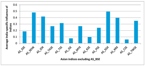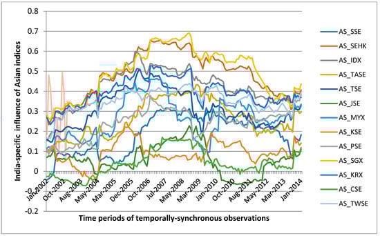 The India-specific influence strengths of the 13 Asian indices in the network were computed next. We refer to the India-specific influence strength of an index as the weight of the edge connecting the Asian indices with the Indian market index (AS_BSE). The true measures of the weight are considered here without any sign conversions, so that directionality of the India-specific influence can be captured using this metric.