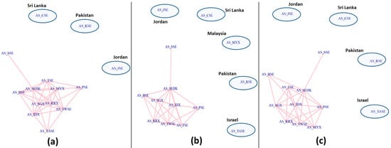 For enquiring about the state of segmentation during the 2008 financial crisis, the Asian market indices’ returns were segregated into three time-frames: (i) pre-crisis period: 1 August 2006–15 September 2008; in this period, the study data possess 530 data points for each of the Asian indices; (ii) the crisis-period: 16 September 2008–21 July 2011; in this period, the study data possess 704 data points for each of the Asian indices; and (iii) post-crisis period: 22 July 2011–30 September 2013; in this time-frame, the study data possess 547 data points for each of the Asian indices. The current study adopted the time frames used in the study by Yang et al. [72] for the temporal segmentation of the pre-crisis, the crisis and the post-crisis periods. After performing the temporal segmentation steps, the weighted networks were built for each of the three observations employing similar methodologies explained in the earlier sections. Next, threshold filtering is performed on the three weighted networks (belonging to pre-crisis, crisis and post-crisis periods), and these networks are visually compared to decipher the segmentation patterns.