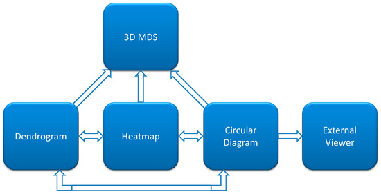 The developed web-based platform for interactive visualization of similarity and distance matrices consists of four major interconnected components: heatmap, dendrogram, circular diagram, and three-dimensional MDS scatterplot. Figure 1 illustrates interaction of these components in CoeViz. Their specific implementation is described below.