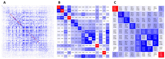 The heatmap presents covariance data (or similarity data, in general) based on one of the implemented covariance metrics [1]. The color gradient spans from white (representing no covariance, 0), through blue (moderate, 0.5) to red (high covariance, 1). The main diagonal contains frequencies of given amino acids observed at the individual positions in a given MSA. Heatmaps are zoomable from single pixel per position to large grid cells presenting detailed information, such as row and column indexes, corresponding residue labels and covariance scores. For quick navigation, heatmaps can be dragged with a mouse to pan to another part of the grid or be refocused using either a navigation pane or another visualization component. Figure 2 shows the same heatmap at different zoom levels.