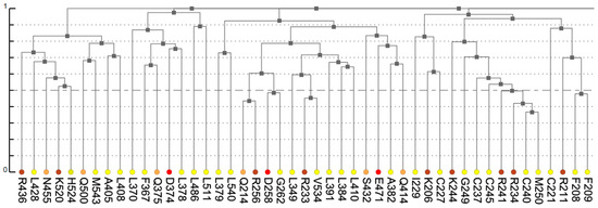 A fragment of the dendrogram derived from hierarchical clustering of co-varying residues (leaves). Colors reflect physico-chemical properties of amino acids. The color notation is as previously defined [2].