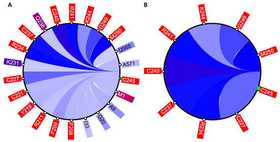 The circular relation diagram centered on the residue C245 with its top co-varying residues at cutoffs (A) 0.1 and (B) 0.2. Labels on the diagram represent amino acid residues and their positions in protein sequence. Colors of these labels are the same as those on the main diagonal of the heatmap. Colors of the arcs represent covariance scores between two given positions.