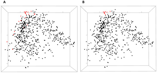 3D multidimensional scaling (MDS) scatterplots of co-varying residues in human ESR1. (A) Highlighted red are the residues corresponding to panel A of Figure 4. (B) Red dots correspond to residues on panel B of Figure 4. Both black and red dots can be optionally labeled with the residue identifiers but not shown here for a more clear view.