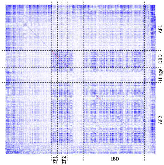 The heatmap of co-varying residues in human ESR1 protein as measured using χ2 statistic adjusted for phylogenetic bias in the multiple sequence alignment. White points indicate no covariance, blue—moderate, and red—high covariance between a pair of residues. Points on the main diagonal represent frequencies of observing a given amino acid throughout the MSA at a given position. Boundaries of the domains and regions were marked with black dashed lines following the annotation of the UniProt database. Domains: AF1—transactivation domain 1; DBD—DNA-binding domain; Hinge – hinge domain; AF2—transactivation domain 2. Functional regions: ZF1 and ZF2—zinc finger domains; LBD—ligand binding domain.