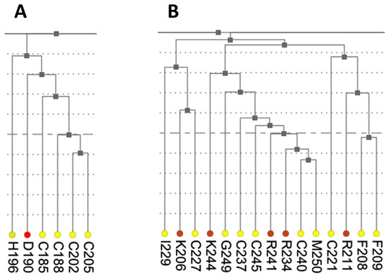 Fragments of the hierarchical clustering tree for co-varying residues in human ESR1. (A) Cluster containing the metal coordinating residues from Zn finger 1 (C185, C188, C202, and C205). (B) Cluster containing the metal coordinating residues from Zn finger 2 (C221, C227, C237, and C240).