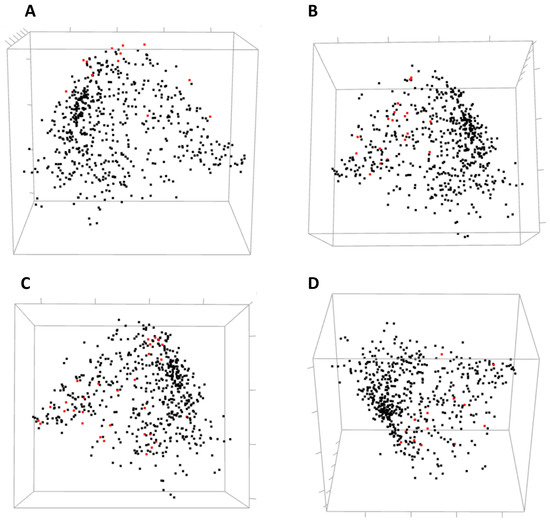 Three-dimensional MDS scatterplots of co-varying amino acids in human ESR1. Highlighted in red are the residues involved in different molecular functions: (A) DNA binding; (B) binding estradiol; (C) homodimerization of hormone receptor; (D) interaction with a co-activator.