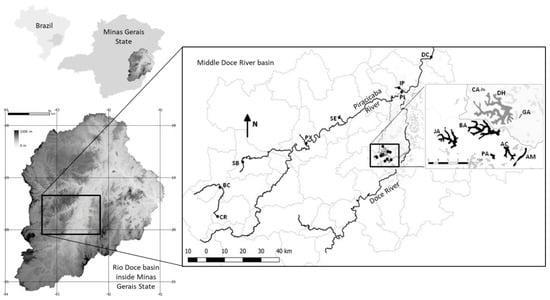 The mid-catchment of the Doce River basin showing the Piracicaba River with the eight samples points (CR—Caraça, BC—Barão de Cocais, SB—Santa Bárbara, PX—Peixe, SE—Severo, IP—Ipatinga, PI—Piranga, DC—Doce) and eight lakes (JA—Jacaré, BA—Barra, PA-Palmeirinha, AC—Águas Claras, AM—Amarela, CA—Carioca, DH—Dom Helvécio, GA—Gambazinho). In light gray are the municipality’s limits. The whole river network is not shown.