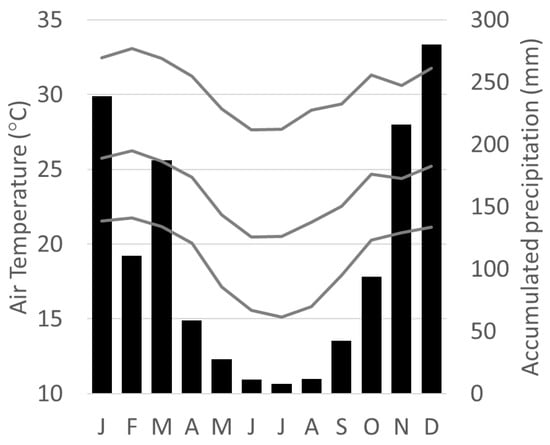 Seasonal climate pattern of the mean, maximum, and minimum air temperature (gray lines), and the accumulated precipitation (bars) measured by the meteorological stations located in Ipatinga City between 1998 and 2013.