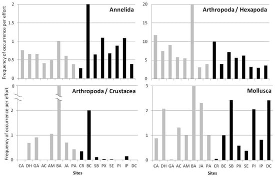 Specimens are identified at the lowest possible taxonomic level as possible, mostly at the family level (Table 4). Some taxa were identified until the genus or the species level. Four phyla were represented: Mollusca, Annelida, Arthropoda, and Platyhelminthes. Seven classes were identified: Insecta, Bivalvia, Gastropoda, Clitellata, Malacostraca, Ostracoda, and Arachnida. For Insecta, 76 families were identified, one family was identified for Crustacea, and nine families were identified for Mollusca.