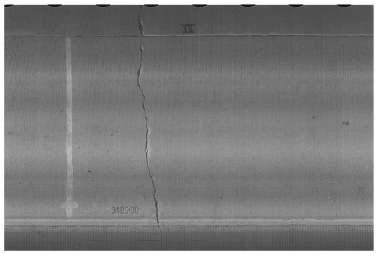 A sample Portland cement concrete (PCC)-surfaced pavement distress image captured using pavement data collection vehicle moving at highway speed and equipped with a downward-looking high-speed digital camera (Source: FHWA LTPP database).