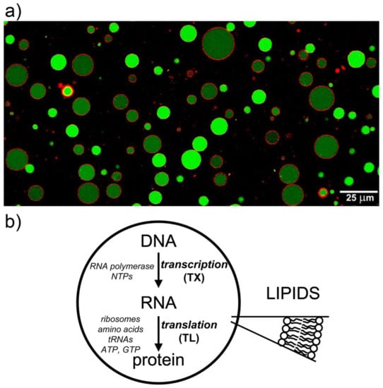 The laboratory construction of semi-synthetic minimal cells [1,2,3,4,5,6,7,8] is one of the most well-known bottom-up synthetic biology projects. It was conceived within the context of “chemical autopoiesis” [9,10,11], mainly promoted by Pier Luigi Luisi and collaborators. It consists of the building of cell-like systems of minimal complexity by encapsulation of (bio)chemicals inside lipid vesicles (i.e., liposomes), see Figure 1a. One of the milestones on the roadmap toward the construction of minimal cells is the production of proteins inside liposomes. This is achieved by employing cell-free systems that perform transcription (TX) and translation (TL) reactions based on a given DNA sequence. The TX–TL ‘machinery’ is composed of about 80 macromolecules (RNA polymerase, ribosomes, tRNAs, aminoacyl-tRNA synthetases, etc.) and dozens of small molecules (nucleotides, amino acids, salts, etc.). Liposomes are prepared so that the whole TX–TL machinery is entrapped in their aqueous lumen, in order to produce a desired protein inside (Figure 1b). A protein-synthesizing liposome is therefore a key structure that is necessary for further elaborations and further assembly of more complex cell-like system.