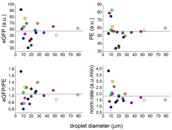 Due to the small number of droplets, data in Figure 2 have just an illustrative scope (no statistical conclusions can be drawn). Qualitatively, the experiment shows high between-droplets variability of both eGFP and PE concentrations. The variability is higher-than-expected because of the very large size of the droplets (stochastic fluctuations would account for ≤2% variability [16]). Expectedly, small droplets (<30 μm) display higher between-droplet variability than larger ones. The eGFP/PE ratio and the PE-normalized rate are indeed very variable too, suggesting that the source of droplet diversity has a more complex nature and depends on uncorrelated stochastic partition of each of the TX–TL components.