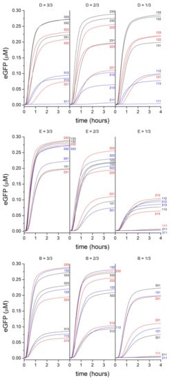 We prepared, in combinatorial manner, several PURE system variants that contain different amount of D, E, and B. In particular, for practical reasons we could explore only variants that can be obtained by dilution of the D, E, and B sub-sets. Dilution factors were set to 3/3 (undiluted), 2/3 (diluted), and 1/3 (diluted). We will refer to them with the labels “3”, “2” and “1”, respectively, and in the following order: D, E, B (Table S1). For example, the variant “333” refers to undiluted PURE system and [DNA] = 22 nM; “123” refers to a combination of diluted DNA (to 1/3 of its initial concentration, i.e., 7.3 nM), diluted mix E (to 2/3 of its initial concentration), and undiluted mix B. The resulting 27 (33) PURE system block-variants were allowed to produce eGFP in bulk, the sigmoidal increase of fluorescence was monitored in time, and finally converted to eGFP concentration thanks to a calibration curve (Figure 3). The full numerical dataset of 27 kinetic traces can be found as a supplementary file.