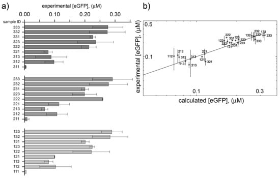 PURE system ‘variants’. (a) End-point (after six h) eGFP concentration of 27 PURE system samples with different concentrations. Sample ID represents the dilution factors of D, E, and B sub-sets (e.g., sample ID “321” refers to a sample prepared from “D” = 3/3, “E” = 2/3, and “B” = 1/3 of stock concentrations; see Table 1 and Table S1). The error bars indicate the standard deviation of two independent experiments. (b) Comparison between experimental and calculated end-point eGFP concentrations. The calculated values have been obtained by a simultaneous fit of the 27 kinetic traces (Figure 3) using the minimal PURE system in silico model (Figure S1) [17,30]. It was not possible to fit the three low-production variants “311”, “211” and “111”. Best-fit parameters are given in Table S4. The diagonal line represents y = x values.