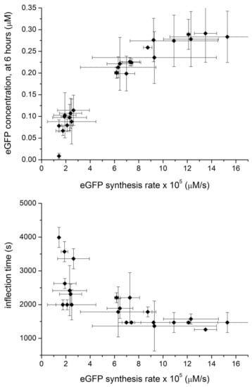 Relation between end-point [eGFP], measured after 6 h and eGFP maximal production rate (at the inflection point of the sigmoidal curve) (top). Relation between the eGFP maximal production rate and the inflection time (bottom).