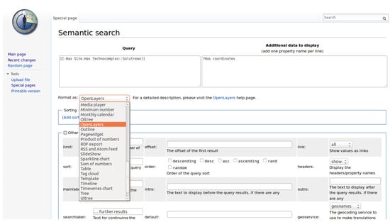 - Koren, Y.; Kong, J.H.; Gambke, S.; Dauw, J.D. Semantic Result Formats SemanticMediaWiki Extension, 2017. Available online: https://semantic-mediawiki.org/wiki/Semantic_Result_Formats (accessed on 23 October 2018).
