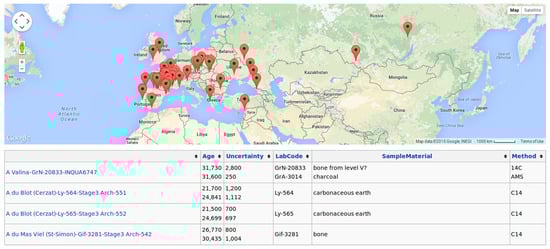 - D’Errico, F.; Banks, W.E.; Vanhaeren, M.; Laroulandie, V.; Langlais, M. PACEA Geo-Referenced Radiocarbon Database. PaleoAnthropology 2011, 2011, 1–12. [Google Scholar]