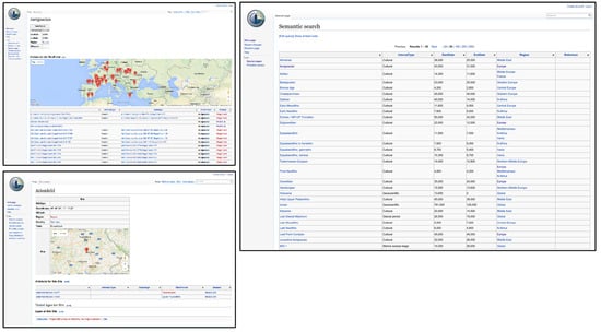 Figure 7 shows screenshots of the Contextual Areas Wiki application. For example, in the upper left, a screenshot of a TimePeriod definition is given. In this case, it is the definition of the Aurignacien cultural period. On this TimePeriod knowledge item page, a map showing all Site objects containing Artefacts attributed with Aurignacien. Additionally, all Artefacts of this TimePeriod are listed in a broad table below the map.