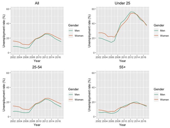 Spanish economy was one of the most affected between EU countries during the financial crisis of 2008 and employment figures were seriously damaged, particularly because of the bursting of the real estate bubble. A decade after one of the biggest crises of the century, the Spanish economy continues to move forward to get out of the economic downturn and recover the welfare and quality of life prior to the crisis. Although a multitude of economic indicators have improved during the last years, unemployment rates are still among the highest in the EU context. According to data from the Spanish Labor Force Survey (Encuesta de Población Activa, EPA), today there are almost twice as many unemployed in Spain as ten years ago. The unemployment rate in 2007 was 8.57%, while today it is almost double that figure. Furthermore, official statistics also remark that unemployment is not distributed homogeneously across regions, age, gender or educational level. Figure 1 depicts how the unemployment rate has evolved in Spain over the last 15 years. The top-left picture shows remarkable differences regarding gender. We can see how women were disfavoured before the 2008 financial crisis, with a gap of 5 points on average compared to men. The crisis alleviated this gap, but the difference between women and men is increasing steadily once the economic recovery is initiated. This situation is mainly explained by those unemployed between 25 and 54 years old (bottom-left picture). We observe no significant difference regarding the unemployment rate between younger (under 25, top-right picture) and older (55 or more, bottom-right picture) people. All in all, people under 25 years old remain as the most vulnerable group, despite its employment recovery is more significant compared to other groups.