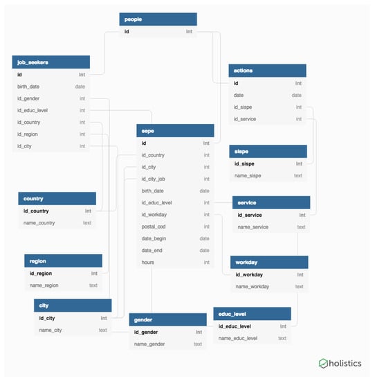 The database is composed by 12 tables as depicted in Figure 2. Those unfamiliar with entity-relationship modeling can refer to [17]. The biggest ones are job_seekers, sepe and actions. All these tables include the variable id which identifies the unemployed person considered in the research. While the identity card number was originally included in the database, this variable has eventually been modified to preserve the anonymity of sample participants.
