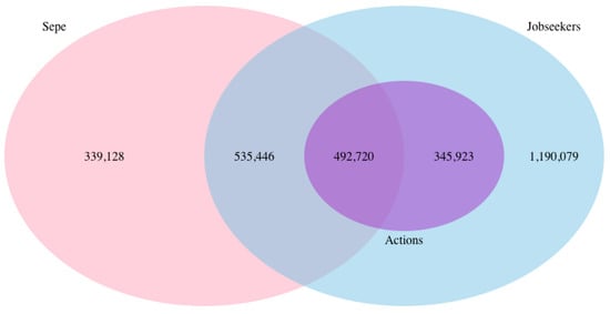 Regarding the size of the sample, Figure 3 shows the number of different people included in each table along with the people in common with other tables. We have to remark that all people in table actions is also in table jobseekers, because any person attending to actions promoted by the SERVEF must be first registered as a jobseeker. Altogether the number of participants enrolled in actions promoted by SERVEF was 838,643 people. Of those, 429,720 succeed in finding a job (and then, their contracts were registered in table sepe), while 345,923 correspond to unsuccessful people regarding employment search (so not present in sepe). All these 838,643 people were involved in 2,979,665 training activities, which implies that every person was enrolled in 3.55 activities in average.