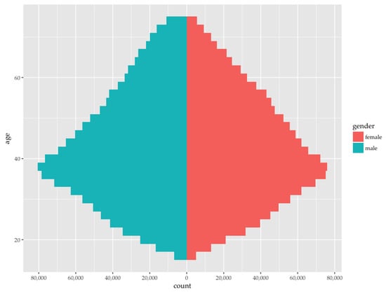 An interesting point is to analyse how jobseekers are distributed along age and gender. Figure 4 depicts the number of jobseekers according to these two variables. We can observe that women and men’s distributions are almost symmetrical, with no differences regarding age. The jobseekers table is composed by 1,236,452 women and 1,310,874 men, although the unemployment rate for women is higher than the one registered for men.