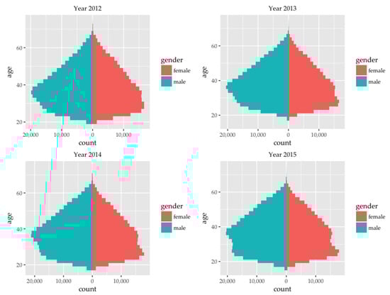 Figure 5 shows the yearly distribution of jobseekers regarding its age and gender. The figure shows some slight differences for the period covered in our analysis. The proportion of young people, around 25 years old, is increasing during this period. We can see how the base of the pyramid is steadily growing, and young women are noticeably becoming more numerous between jobseekers. This could highlight a serious concern for political decision makers, because official figures reveal that, in general terms, women constitute a vulnerable group between unemployed; but more specifically young women are suffering the problem of job exclusion. Therefore, political initiatives should be lead and funded to protect them as a particularly vulnerable group.