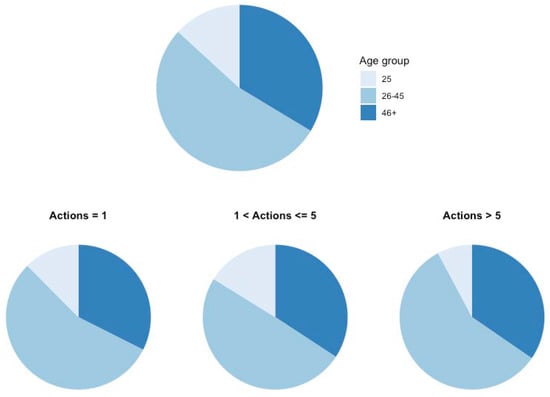 Regarding the number of actions in which unemployed people have been enrolled in, we have analysed differences across age. Figure 6 shows that more than 50% of actions are accomplished by people between 26 and 45 years old. Although young people is the biggest group in the jobseekers’ figures, it is rather surprising to observe just the opposite regarding training courses’ attendance. Figure 6 shows that people 25 years old and below are less willingness than older people to participate in those initiatives promoted by SERVEF to increase their employability prospects. If we distinguish the number of actions accomplished, differences are even more significant. Figure 6 depicts the age distribution for those attending only one action, from two to five actions, and those attending more than 5 actions. The bigger difference is observed for those attending more than five initiatives. We can see this group is mainly composed of people between 26 and 45 years old. It is interesting to note that people 46 year old and over remain quite stable in all three clusters. This way, we can conclude that the loss of interest in attending training initiatives between younger people is mainly covered by people between 26 and 45 years old. It should be analysed what are the reasons that explain the disaffection among young jobseekers, despite training initiatives have been proved to improve the employability prospects in general terms.