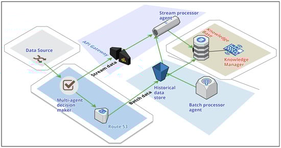 Multi-Agent Lambda Architecture (MALA). Three components of MALA are: historical data store, stream processor, knowledge miner. Real-time and batch layers act as autonomous multi-agent systems in collaboration. A multi-agent decision-maker component is placed in the MALA stack at the gateway of the data pipeline for further processing.