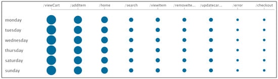 Figure 6. Punch card view of user behavior in the e-commerce portal grouped by day of the week. It also reveals the chart conversion from item added to cart to final checkouts. Only a tiny percentage of cart additions converts to checkouts. With MALA using a moving average of one week, graph can be updated at the end of each week and predict future behavior. - Outlier chart for unusual buying patterns. See Figure 7.