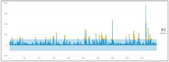 Figure 7. Outliers chart for unusual buying patterns. The x and y axes mark the data volume and quantity of purchases. The algorithm finds the outlier for unusually high or low quantity of purchases through the mix of stream and batch k-means clustering methods. Yellow dots mark the outliers. - Rolling hourly prediction count of number of checkouts. See Table 1.