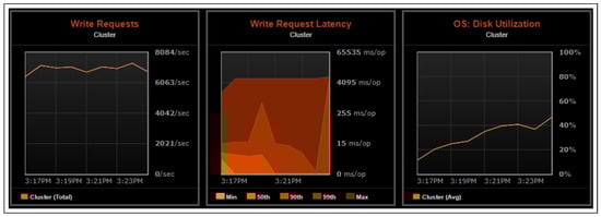 Statistics shown for write requests, write request latency, OS disk use. Write requests: the count of writes per second on the coordinator system. Monitoring the number of requests over time exposes system write load and usage patterns. Write request latency: The 90th and 99th percentiles, min, median, max of a client node write. The period initiated with a node receives a client write request and ends with the node responding back to the client. Considering the consistency setting and replication factor, this includes the network delay from writing to the replicas. OS disk use: CPU time used by disk I/O.