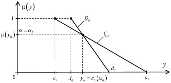 If where according to (59), then, for example, as the next step, it is necessary to implement the polynomial approximation or linear interpolation procedures. Let us find for based on the fuzzy set (59) and the linear interpolation approach: