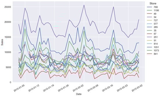 For our analysis, we used store sales historical data from “Rossmann Store Sales” Kaggle competition [34]. These data describe sales in Rossmann stores. The calculations were conducted in the Python environment using the main packages pandas, sklearn, numpy, keras, matplotlib, seaborn. To conduct the analysis, Jupyter Notebook was used. Figure 1 shows typical time series for sales, values of sales are normalized arbitrary units.