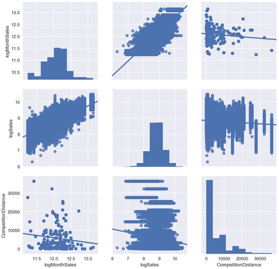 Pair plots with log(MonthSales), log(Sales), CompetitionDistance.
