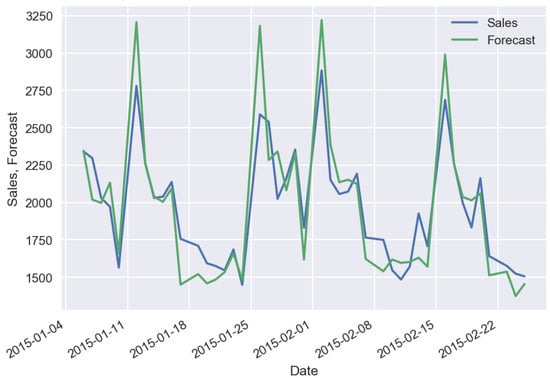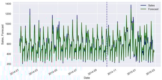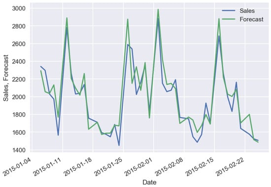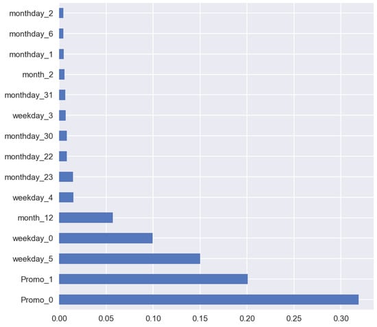 A specific feature of most machine-learning methods is that they can work with stationary data only. In case of a small trend, we can find bias using linear regression on the validation set. Let us consider the supervised machine-learning approach using sales historical time series. For the case study, we used Random Forest algorithm [28]. As covariates, we used categorical features: promo, day of week, day of month, month. For categorical features, we applied one-hot encoding, when one categorical variable was replaced by n binary variables, where n is the amount of unique values of categorical variables. Figure 5 shows the forecasts of sales time series. Figure 6 shows the feature importance. For error estimation, we used a relative mean absolute error (MAE) which is calculated as .