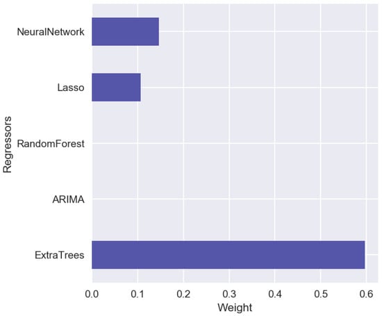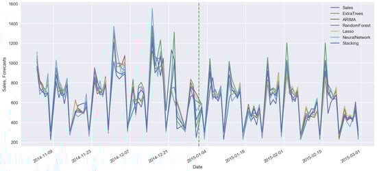 Having different predictive models with different sets of features, it is useful to combine all these results into one. Let us consider the stacking techniques [19,20,21,22,23,24] for building ensemble of predictive models. In such an approach, the results of predictions on the validation set are treated as input regressors for the next level models. As the next level model, we can consider a linear model or another type of a machine-learning algorithm, e.g., Random Forest or Neural Network. It is important to mention that in case of time series prediction, we cannot use a conventional cross validation approach, we have to split a historical data set on the training set and validation set by using period splitting, so the training data will lie in the first time period and the validation set in the next one. Figure 12 shows the time series forecasts on the validation sets obtained using different models. Vertical dotted line on the Figure 12 separates the validation set and out-of-sample set which is not used in the model training and validation processes. On the out-of-sample set, one can calculate stacking errors. hlPredictions on the validation sets are treated as regressors for the linear model with Lasso regularization. Figure 13 shows the results obtained on the second-level Lasso regression model. Only three models from the first level (ExtraTree, Lasso, Neural Network) have non-zero coefficients for their results. For other cases of sales datasets, the results can be different when the other models can play more essential role in the forecasting. Table 1 shows the errors on the validation and out-of-sample sets. These results show that stacking approach can improve accuracy on the validation and on the out-of-sample sets.