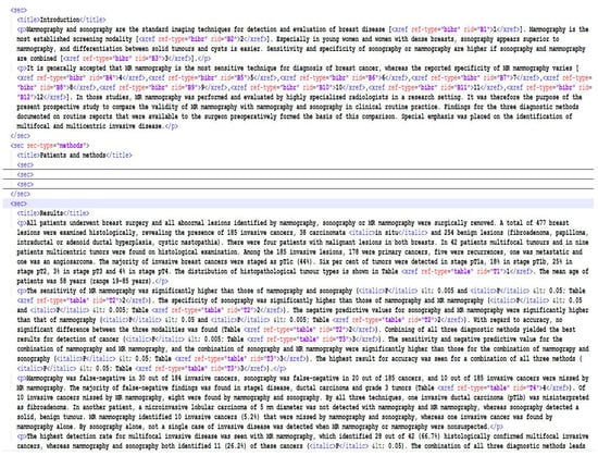 An excerpt of the structure of the XML files for each article is presented in Figure 1. Each article was divided into its composing sections, enclosed into the <sec> tag. Although the structure of each article was different, according to the specific requirements of the publishing journal, there were some common sections appearing in most scientific writings: Abstract, introduction, methods, results, conclusions. Each section contained a <title> tag and a set of paragraphs (<p> tags). Owing to space restrictions, only the introduction section and part of the results section are presented in Figure 1.