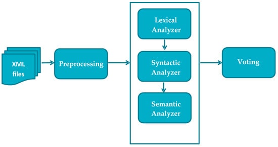 The second module was the syntactic analyzer, presented in Figure 4. The part-of-speech (POS) tagging was performed using a RACAI POS tagger (http://www.racai.ro/en/tools/) for English. We chose this tagger instead of the NLTK’s POS functionality, since it facilitated the extraction of the verbal voice, a feature that we further used. Once parts of the speeches had been identified, we extracted two features: (1) The use of a passive or active voice, and (2) the preference for using the first or third person for both verbs and pronouns. We considered that the voice of the scientific articles is relevant, since in the argumentation theory, the active voice is preferred and considered to indicate more commitment. The passive voice, on the contrary, indicates a certain distance from what is being presented.