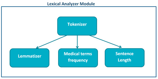 The first module was the lexical analyzer (see Figure 3), which tokenized the text to identify each word. From this step, the sentence length could be obtained.