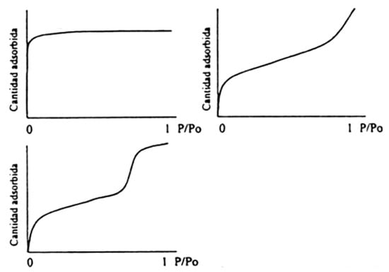 5. (1.5 points) Nitrogen physisorption data at 77 K have been obtained for three porous materials, obtaining the isotherms presented in Figure 2. Based on the classification established by the IUPAC (Types I to VI), what type of isotherms is each one of them?