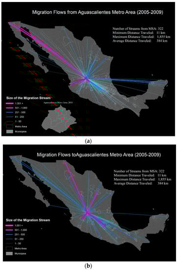 Spatial distribution of migration flows (a) from, and (b) to the Aguascalientes metropolitan area, 2005–2009. Notes: map generated using ArcGIS.