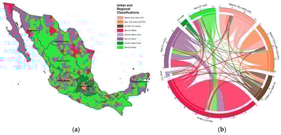 (a) Municipal classification map of Mexico and (b) flows of migrants between them, 2005–2009. Note: Base of the plot pertains to both region of origin (flows from part of base with no white gap) and destination (flows ending in part of the base with white gap). Size of flow indicated in 10,000s. Map generated using ArcGIS; Circoplot generated using the circlize package in R.