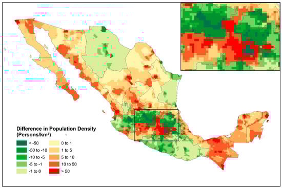 Difference in projected population density between the Mexican National Population Council and Shared Socioeconomic Pathway 2 scenarios for Mexico (2050).