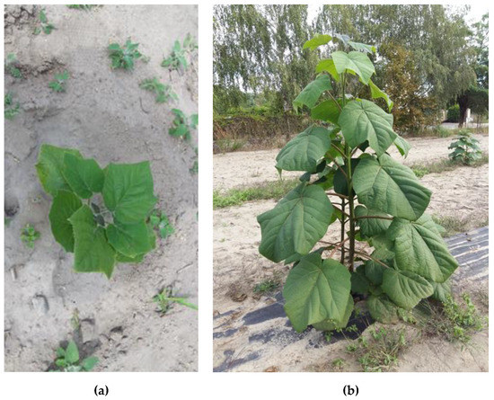 Paulownia tree before pruning. Planted on 16 May 2016. Image (a) was photographed on 13 June. Image (b) was photographed on 27 September 2016; the Oxytree was approximately 0.9 m tall. Geotextile is visible in the front row (as one of the treatments) in image (b). Oxytrees in the background row were cultivated without geotextile.