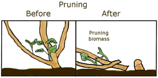 In vitro shoots propagated to ~20–40 cm were planted with 4 m × 4 m (16 m2 per tree) spacing on 19 May 2016. The trees subjected to analysis were pruned on 27 September 2016, as is presented in Figure 2. Analyzed trees represent biomass after 1 year of vegetation. Normal agro-technical care treatment takes place 12 months after planting in May. This agro-technical care treatment involves trimming 0.05 m above the pitch to derive one main shoot, which would become the main trunk of the tree.