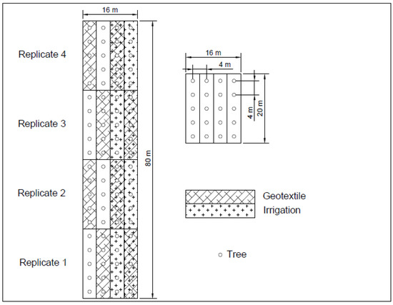 At the initial stage of the plants’ development, 1 month after planting, all plants were irrigated (50 dm3·tree‒1 per month, irrigated twice a week). Management of weeds included mechanical operations. Weeds in the inter-row were removed mechanically with a weeder and an active harrow. Weeds were removed mechanically every 2 months. Weeds between the plants in a row were removed manually using a hook. The schematic of planting on each plantation is presented in Figure 3.