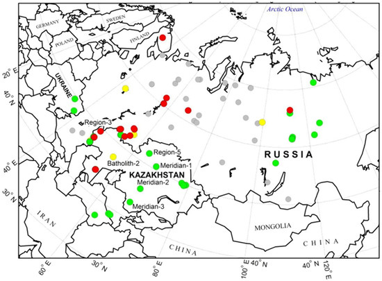 USSR PNEs locations. Green events represent locations determined or verified within 1 km accuracy; red events indicate GT0-1 locations determined where the new coordinates exceed the location errors published by [8]; yellow events were studied but the locations could not be determined or verified, or evidence exists that the true location error is greater than that published by [8]; gray events have not yet been investigated [13].